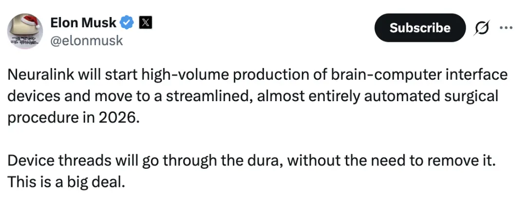 马斯克表示,到2026年,Neuralink的植入手术将升级为一种「高度简化、几乎完全自动化的流程」。